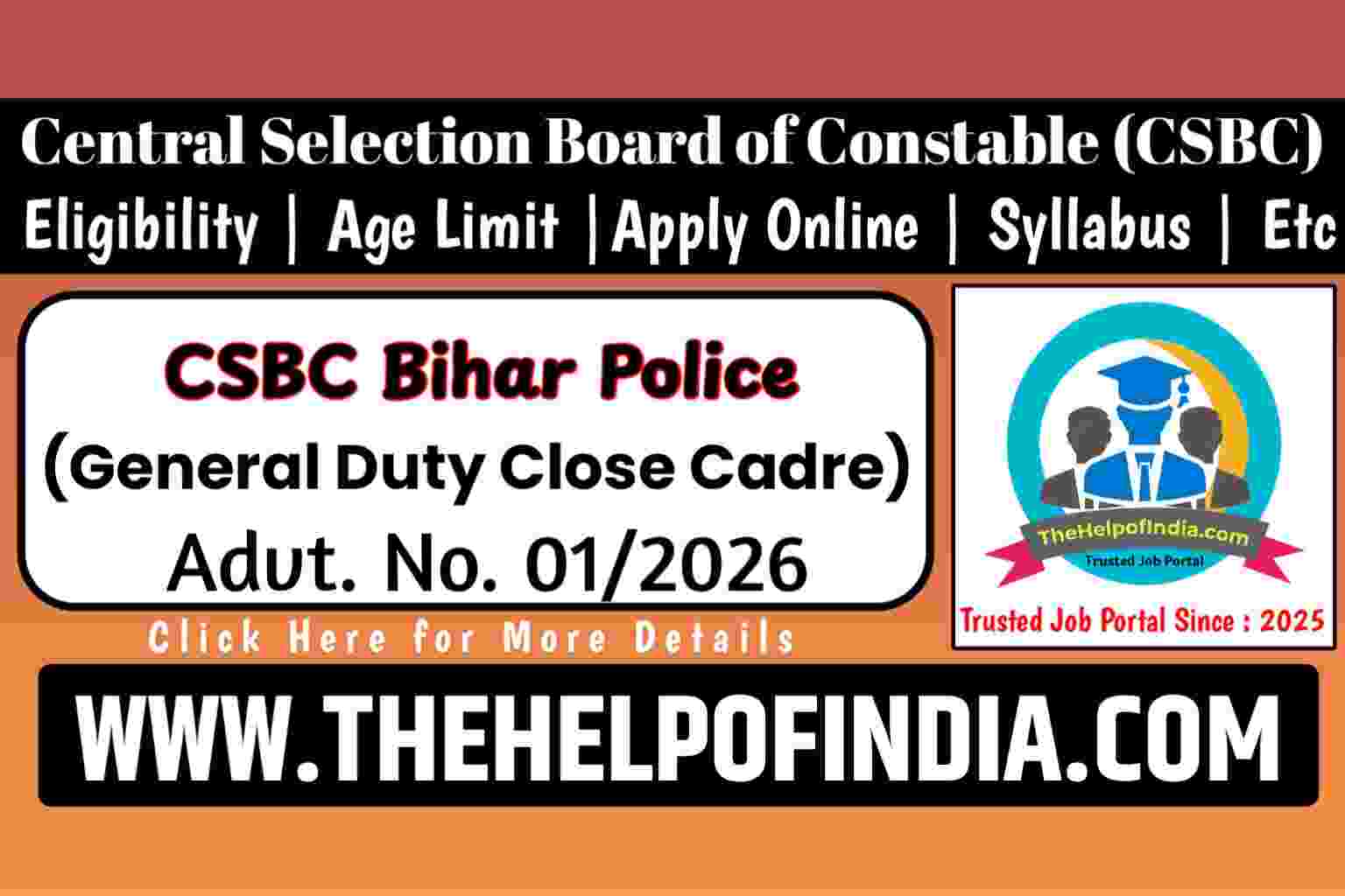 Board Name Central Selection Board of Constable (CSBC) Advt. No. 01/2026 Post Name Constable (General Duty Close Cadre) Total Vacancies 83 PostsOnline Application Start Date 06/02/2026 Online Application Last Date 05/03/2026 Mode of Application Online Eligibility Criteria 10+2 / Intermediate Exam Pass Candidates are Eligible. Age Limit 18 to 25 Years Official Website csbc.bihar.gov.in